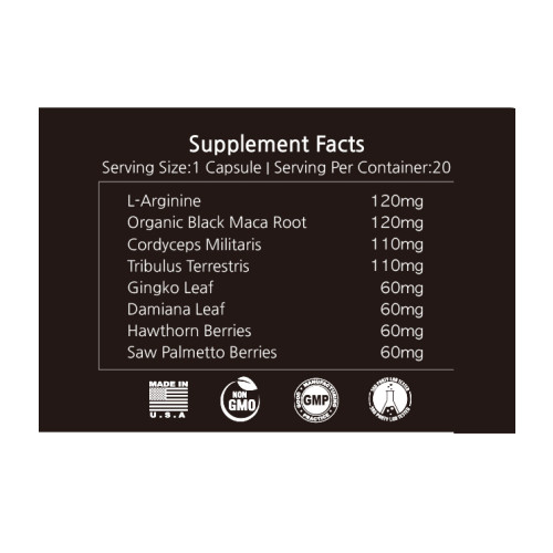 Tribulus Terrestris (남가새), Damiana Leaf (다미아나). Gingko Leaf (은행잎 추출물), Hawthorn Berries (산사나무 열매), Saw Palmetto (쏘팔메토)